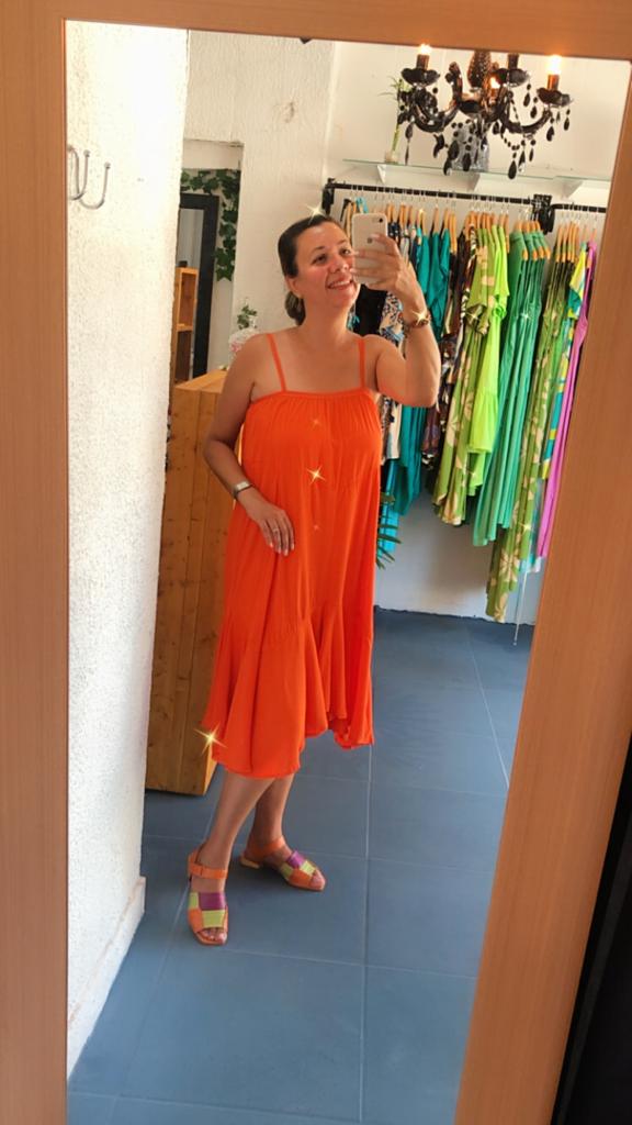 Vestido em viscolinho, modelagem ampla e com recortes na barra, alça regulável e elástico no busto.